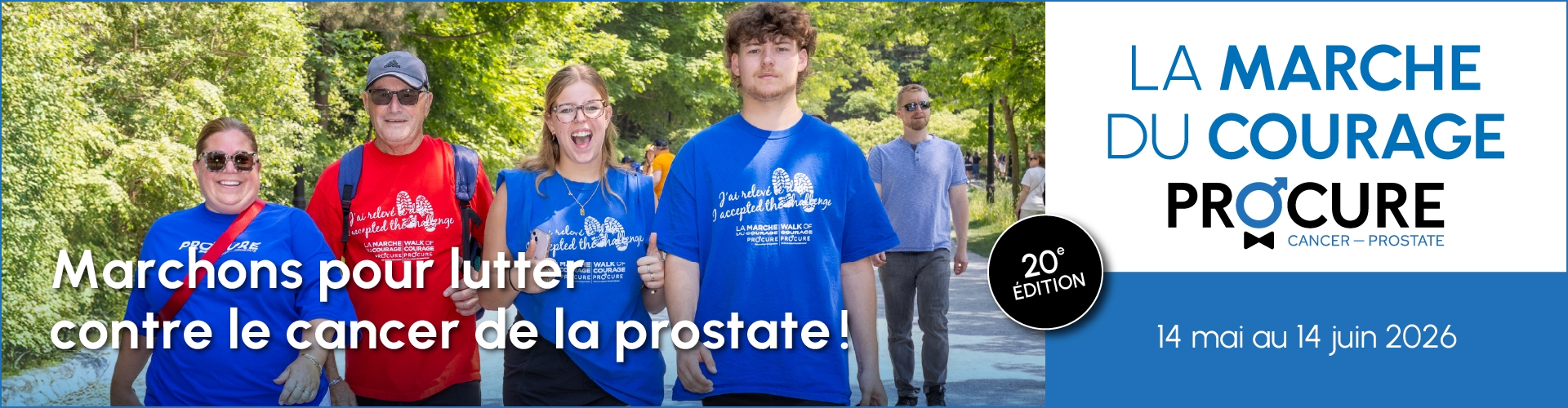 En vous inscrivant ou en faisant un don à La Marche du Courage PROCURE, vous permettez à notre organisme d'offrir des services d'information et de soutien gratuits pour les hommes atteints du cancer de la prostate et leurs proches et vous contribuez au financement de projets de recherche innovateurs sur la maladie.